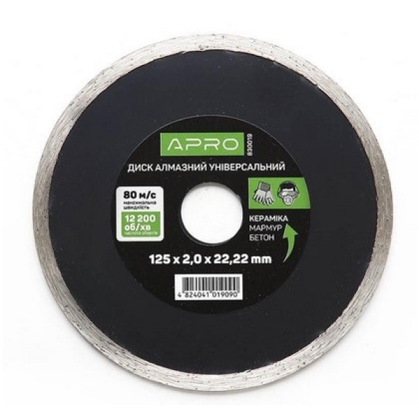 Алмазний суцільний диск APRO діаметром 125 мм, товщиною 2,0 мм та посадковим отвором 22,22 мм призначений для кутових шліфувальних машин. Суцільна кромка висотою 7 мм забезпечує безперервний контакт із матеріалом, що дає максимально чистий і рівний різ. Диск підходить для сухого різу — кругла форма добре охолоджується повітрям під час обертання. Максимальна робоча швидкість становить 80 м/с при допустимому числі обертів 12200 об/хв. Високоякісні матеріали виготовлення гарантують міцність та стійкість до деформацій.