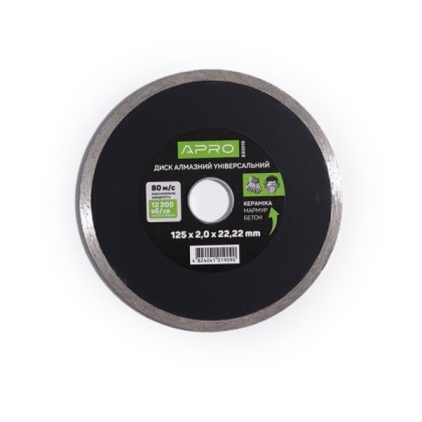 Алмазний диск APRO із суцільною кромкою діаметром 180 мм та посадковим отвором 22,2 мм розроблений для кутових шліфувальних машин. Середній діаметр 180 мм — це вдалий компроміс між глибиною пропилу та маневреністю інструменту. Суцільна алмазна кромка без розривів забезпечує безперервний контакт із матеріалом, що дає максимально чистий різ без сколів та нерівностей. Концентрація алмазного порошку 22-24% розрахована на тривалу роботу з твердими мінеральними матеріалами.