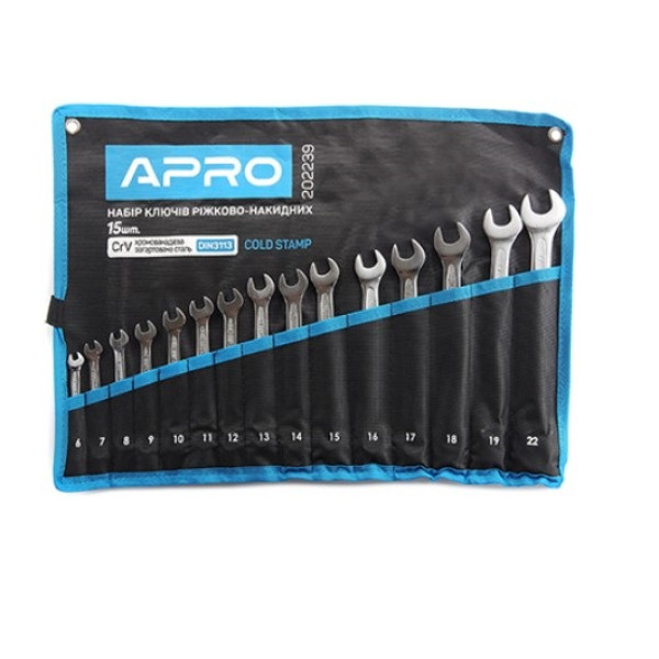 Набір ключів ріжково-накидних CrV 15 шт (6-19, 22мм) (холодний штамп DIN3113) APRO