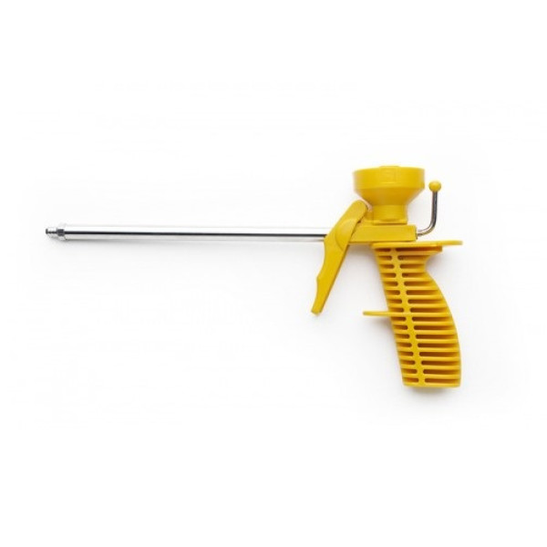 Корпус пістолета виготовлений із посиленого пластику — легкого і достатньо міцного для регулярного використання матеріалу. Мідний наконечник із нікелевим покриттям забезпечує герметичне різьбове з'єднання з клапаном балона і витримує багаторазове підключення і відключення. Механічний курковий механізм рівномірно подає матеріал при кожному натисканні і дозволяє зупинити подачу в будь-який момент.