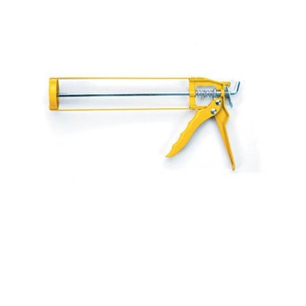 Корпус пістолета виготовлений зі сталі — матеріалу з підвищеною міцністю і стійкістю до деформації при регулярних навантаженнях. Відкрита рамна конструкція повністю охоплює тубу по всій довжині — завдяки цьому тиск на картридж розподіляється рівномірно і матеріал подається стабільно навіть при невеликому залишку в тубі. Штовхальний механізм із храповою передачею рівномірно видавлює матеріал при натисканні на курок. Кнопка розблокування штовхача зупиняє подачу після відпускання курка і запобігає підтіканню герметика.
