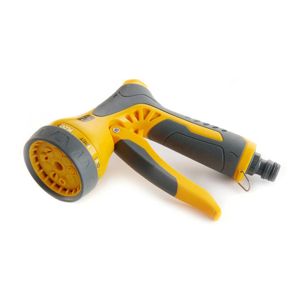 Корпус пістолета виготовлений із міцного пластику з суцільним гумовим покриттям — це захищає інструмент від ударів і подряпин при падінні, а також забезпечує впевнений хват навіть при мокрих долонях. Перемикач режимів розташований на голівці розпилювача і легко обертається однією рукою без зупинки поливання. Регулятор потоку інтегрований у рукоятку для зручного оперативного налаштування. Різьбове з'єднання для підключення до шланга забезпечує надійне і герметичне стикування без протікань.