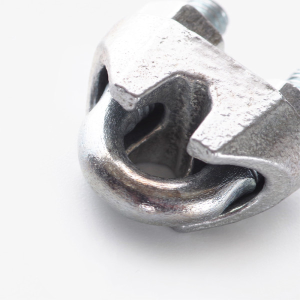 Затискач виготовлений із міцного металу з додатковою цинкувальною обробкою для запобігання іржі. Конструкція складається з двох деталей, які з’єднуються болтами і надійно фіксують трос. Металічний корпус забезпечує довговічність і стійкість до механічних навантажень.