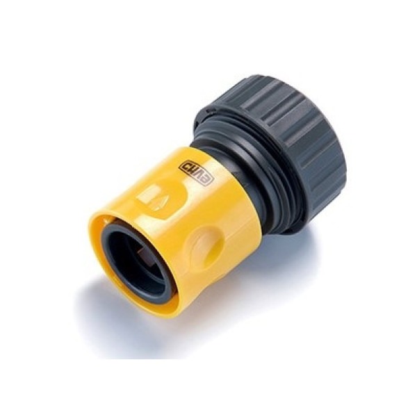 Конектор виготовлений із якісного пластику жовтого кольору. З одного боку — обтискне з'єднання для фіксації на шлангу діаметром 3/4'', з іншого — швидкорознімний механізм із виходом 1/2'' для підключення насадок та інших елементів. Вбудований клапан аквастопу автоматично перекриває потік води при від'єднанні насадки. Грамотна установка конектора забезпечує герметичність конструкції.