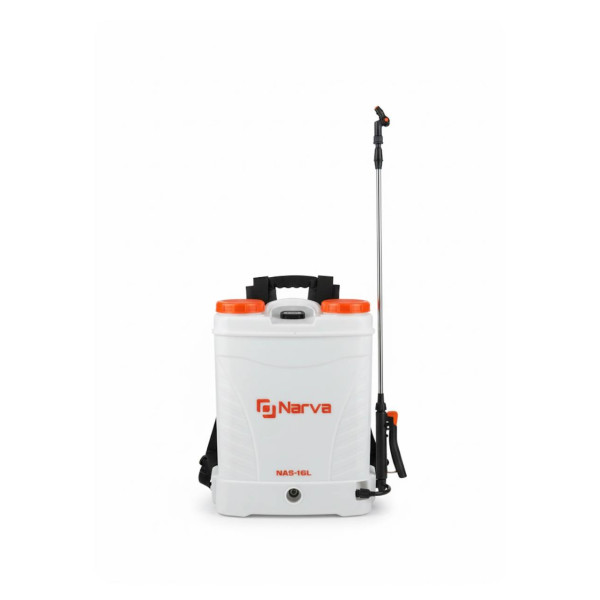 NARVA NAS-16L — акумуляторний ранцевий обприскувач з мембранною мініпомпою, яка створює тиск автоматично без ручного накачування. Акумулятор напругою 12 В та ємністю 8 Аг забезпечує до 10 годин безперервної роботи — один із найвищих показників серед акумуляторних обприскувачів. Бак об'ємом 16 л із міцного стійкого пластику в поєднанні з продуктивністю 3,5 л/хв та робочим тиском 2-4 бар забезпечує дальність обприскування до 15 м. Телескопічна розпилювальна трубка довжиною 125 см виготовлена з нержавіючої сталі та регулюється за довжиною залежно від зросту оператора. Шланг довжиною 120 см з'єднує бак із трубкою. Вбудований вольтметр контролює рівень заряду, регулятор струменя налаштовує інтенсивність розпилення, а вбудований фільтр запобігає засміченню насадок. Чотири змінних насадки дозволяють обрати оптимальний режим обробки. Ранцева конструкція розподіляє вагу 5,5 кг на спину, звільняючи руки для роботи.