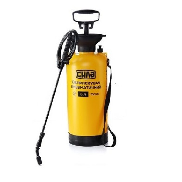 Обприскувач СИЛА 8 л — пневматичний пристрій плечового типу з помповим механізмом подачі. Оператор накачує тиск у баку за допомогою вбудованого насоса, після чого рідина подається через гумовий шланг, металеву трубку та розпилювальну насадку на рослини. Об'єм 8 літрів — золота середина між компактним 2-літровим та великим 16-літровим обприскувачем. Максимальний тиск 3,5 бар забезпечує дальність розпилення до 3 м. Плечова конструкція дозволяє носити обприскувач на плечі, розвантажуючи руки. Вбудований запобіжний клапан автоматично скидає надлишковий тиск. Пластиковий корпус легкий — вага пустого обприскувача лише 1 кг.