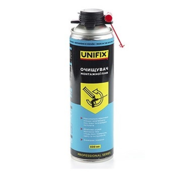 Очищувач монтажної піни 500 мл UNIFIX — професійний багатофункціональний засіб для видалення незатверділих плям і залишків поліуретанових пін та клеїв. Застосовується для очищення пістолетів, клапанів балонів, а також для знежирення поверхонь перед нанесенням герметиків.