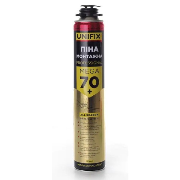 Піна професійна всесезонна MEGA 70+ л 870 мл UNIFIX — монтажна піна збільшеного об'єму з виходом понад 70 літрів. Всесезонна формула дозволяє працювати в будь-яку пору року. Балон місткістю 870 мл — максимальний формат у лінійці UNIFIX для виконання великих обсягів монтажних робіт.