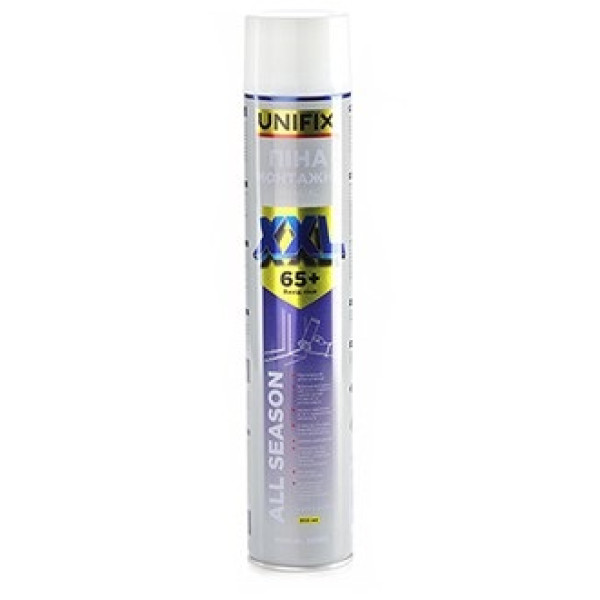 Піна ручна всесезонна XXL 65+ л 850 мл UNIFIX — монтажна піна на поліуретановій основі збільшеного об'єму для роботи без пістолета. Вихід понад 65 літрів із балона 850 мл — максимальний формат серед ручних пін UNIFIX. Всесезонна формула працює при температурі від -10 до +35 °С.