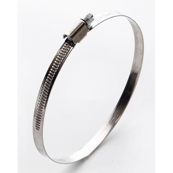 Хомут виготовлений з нержавіючої сталі марки W2 — хромонікелевого сплаву з високою корозійною стійкістю. Черв'ячна конструкція включає перфоровану стрічку шириною 9 мм з товщиною 0,7 мм та затяжний гвинт з черв'ячною різьбою. Черв'ячний механізм забезпечує плавне та точне регулювання зусилля обтиску в діапазоні 4,5–6 Нм за допомогою звичайної викрутки або головки. Стрічка розподіляє тиск рівномірно по площі контакту, запобігаючи локальній деформації шланга. Відсутність покриття обумовлена тим, що нержавіюча сталь W2 самостійно забезпечує захист від корозії.