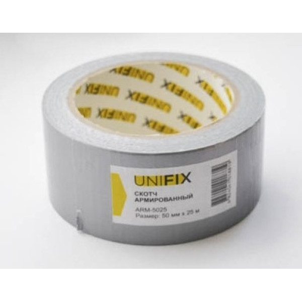 Армована стрічка UNIFIX виготовлена з поліпропіленової основи, підкріпленої тканинною ниткою, що забезпечує підвищену стійкість до розриву порівняно зі звичайним скотчем. Ширина 50 мм — стандартний розмір для більшості монтажних та ремонтних задач. Довжина 25 м — це практичний обсяг, якого вистачає на невеликий об'єкт або серію побутових ремонтів. Клейовий шар із синтетичного каучуку добре працює і на гладких, і на шорстких поверхнях, а товщина 150 мкм надає стрічці достатню щільність для герметизації та захисту.