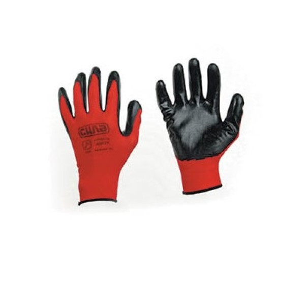 Рукавички з нітриловим покриттям р10 (червоний+чорний манжет без підвіса/хедера) (СИЛА) — міцні робочі рукавички з нітриловим обливом для надійного захисту рук від механічних впливів, мастил та забруднень. Нітрилове покриття забезпечує відмінне зчеплення та стійкість до зносу при інтенсивній роботі.