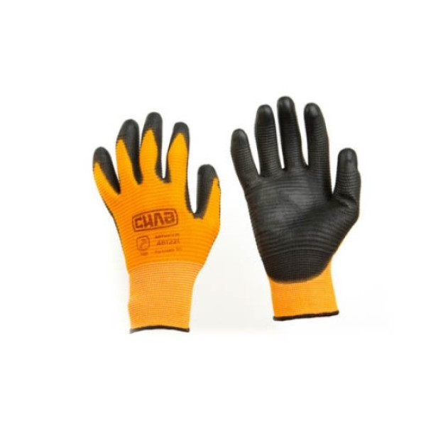 Рукавички з ПУ покриттям р10 (оранж.+чорний манжет) (СИЛА) — легкі та зручні робочі рукавички з поліуретановим покриттям для точних і акуратних робіт. ПУ покриття забезпечує чудове відчуття руки, надійний захват та захист від забруднень і дрібних механічних пошкоджень.