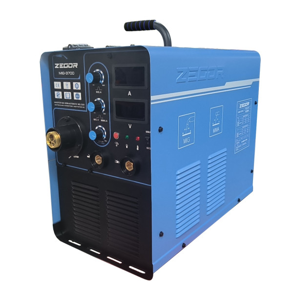 Зварювальний апарат ZEGOR MIG-3700 — потужний інверторний напівавтомат 3-в-1 із підтримкою режимів MIG, TIG та MMA. Максимальний зварювальний струм 370 А та номінальна потужність 9,3 кВА роблять цю модель найпотужнішою в лінійці Zegor MIG. Апарат побудований на технології IGBT, забезпечує стабільну дугу з мінімальним розбризкуванням металу та підходить як для професійного, так і для побутового використання.