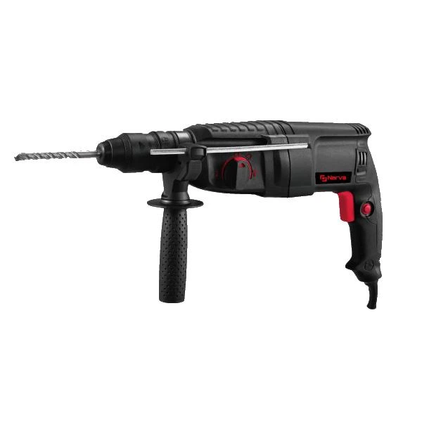 NARVA NRH-26/1450 DFR — прямий перфоратор із міцною конструкцією, розрахованою на важкі роботи. Двигун потужністю 1450 Вт у поєднанні з силою удару 3,5 Дж і частотою 5500 уд/хв забезпечує найвищу продуктивність свердління у своєму класі. Три режими роботи — свердління без удару, ударне свердління і довбання — дозволяють використовувати один інструмент для будь-яких матеріалів: цегляної кладки, бетону, дерева, металу і пластику. Патрон SDS+/DFR забезпечує швидку зміну бурів без інструментів. Вбудовані активні елементи керування швидкістю і режимами підвищують комфорт і точність роботи. Реверс дозволяє швидко вигвинчувати застряглу оснастку, а обмежувач глибини зі комплекту контролює однакову глибину кожного отвору. Вага лише 3 кг робить інструмент зручним при роботі в різних положеннях без зайвої втоми.