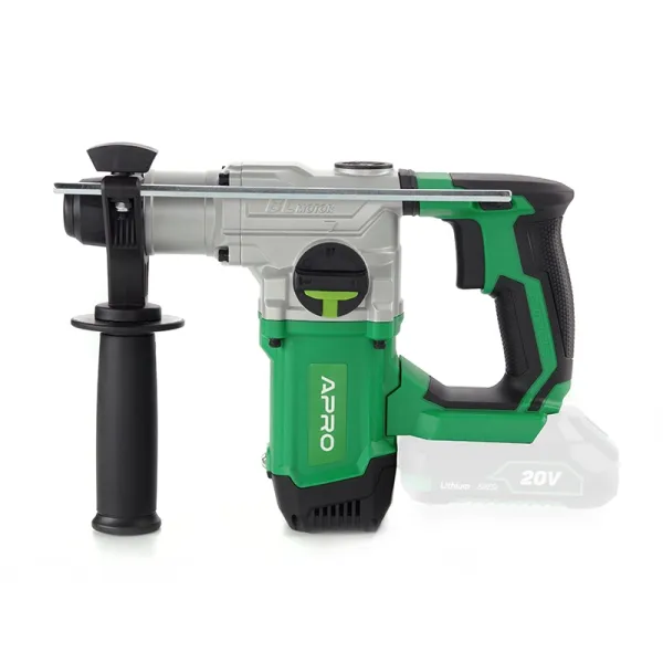 Корпус виконаний із міцного ударостійкого пластику з ергономічними гумовими вставками для надійного утримання та зниження передачі вібрації на руки оператора. Безщітковий двигун розміщений у герметизованому відсіку, що захищає його від пилу при роботі з бетоном і каменем. Патрон SDS+ забезпечує надійне утримання оснастки при ударному навантаженні та дозволяє замінювати бури без ключа за лічені секунди. Сумісність із системою Power E дозволяє використовувати один акумулятор для всього інструменту лінійки APRO.