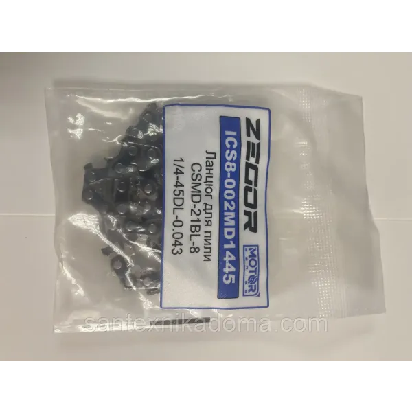 Пиляльний ланцюг ZEGOR ICS8-002MD1445 — змінний ланцюг для шини 8" (20 см), сумісний з акумуляторними пилами ZEGOR моделей CSMD-21BL-8, CSAX-21BL-8 та CSMQ-21BL-8. Крок 1/4", 45 провідних ланок, товщина ланки 0,043" (1,1 мм).
