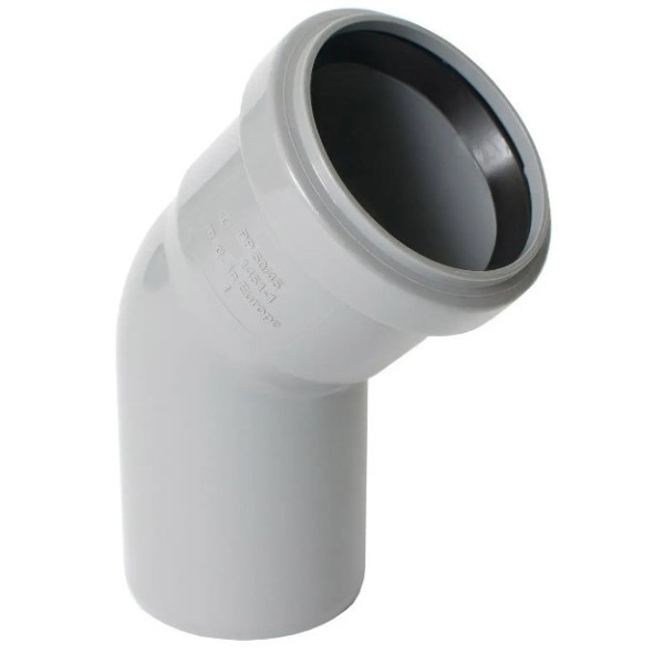 Коліно каналізаційне VSplast 50 мм 45°— це поліпропіленовий фітинг українського виробництва, призначений для з'єднання каналізаційних труб під кутом 45 градусів. Виріб сірого кольору з розтрубним типом з'єднання, товщина стінки 1,8 мм. Діаметр 50 мм є стандартним для відведення стоків від умивальників, кухонних мийок, ванн та душових кабін.