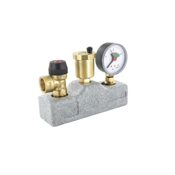 Група безпеки у вигляді компактного вузла включає в себе ключові компоненти: запобіжний клапан, манометр та клапан для видалення повітря. Встановлюється безпосередньо на котли опалення з потужністю до 50 кВт. Модель підходить для домашніх та комерційних систем опалення, де потрібен захист від надмірного тиску та контроль технічного параметра тиску в системі. Теплоізоляція забезпечує мінімальні теплові втрати та підвищує ефективність системи.