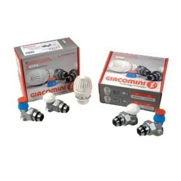 До складу комплекту входять два окремі вироби Giacomini: термостатичний клапан R401TG і запірний клапан R14X033 — обидва кутові, Ду 15, різьба 1/2″. Термоголовка Giacomini R470 приєднується до термостатичного клапана за системою CLIP-CLAP без додаткових інструментів. Сенсор термоголовки реагує на температуру повітря в приміщенні та плавно керує штоком клапана. Підключення до радіатора здійснюється через розбірне з'єднання «американка», що дозволяє легко зняти радіатор без зливу системи.