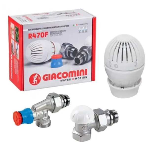 Giacomini R470FX023 — повністю укомплектований італійський набір для осьового підключення радіатора з автоматичним регулюванням температури. Три сумісних елементи в одній упаковці, перевірена якість Giacomini, латунні корпуси клапанів і гарантія 24 місяці — оптимальний вибір для двотрубних систем опалення.