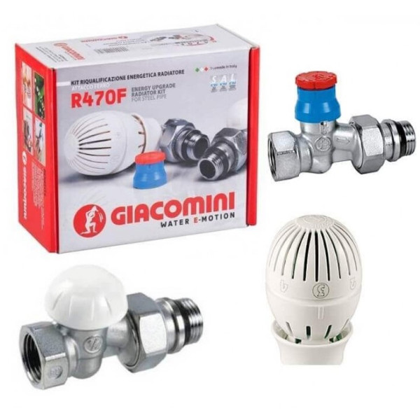 Giacomini R470FX013 — термостатичний комплект для прямого бічного підключення радіатора опалення: прямий термостатичний клапан R402TG, запірний клапан R15X033 і термоголовка R470 з діапазоном 8–30°C. Різьба 1/2″, тиск до 10 бар, підключення CLIP-CLAP — готовий набір для двотрубної системи опалення.