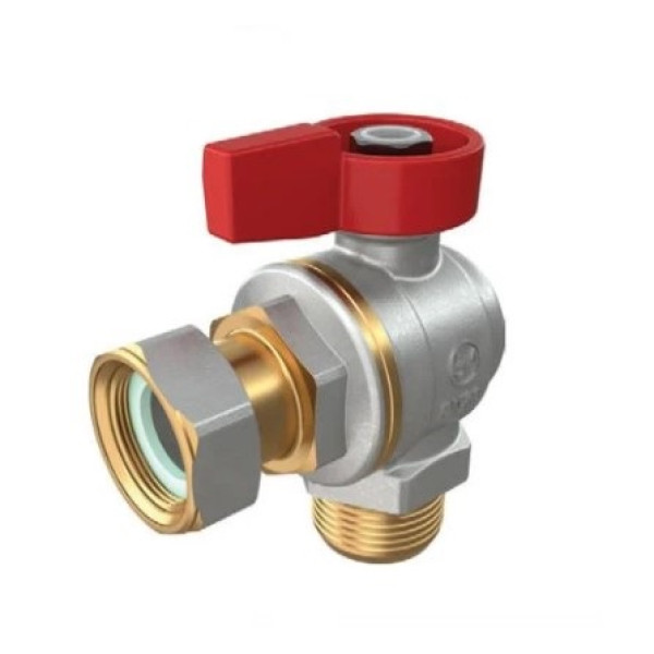 Корпус крана виготовлений із латуні з нікельовим покриттям кутової форми. Ущільнення штока — унікальне рішення Giacomini: чотири прокладки (два фторкаучукових кільця та дві тефлонові плоскі прокладки). Таке подвійне ущільнення гарантує герметичність вузла протягом усього терміну служби без підтягування або ремонту. Ручка-прапорець дозволяє миттєво визначити положення крана. Гайка кріплення ручки зафіксована пломбою, на корпусі — голографічна наклейка. Накидна гайка (напівзгін) забезпечує розбірне з'єднання для демонтажу без злиття системи.