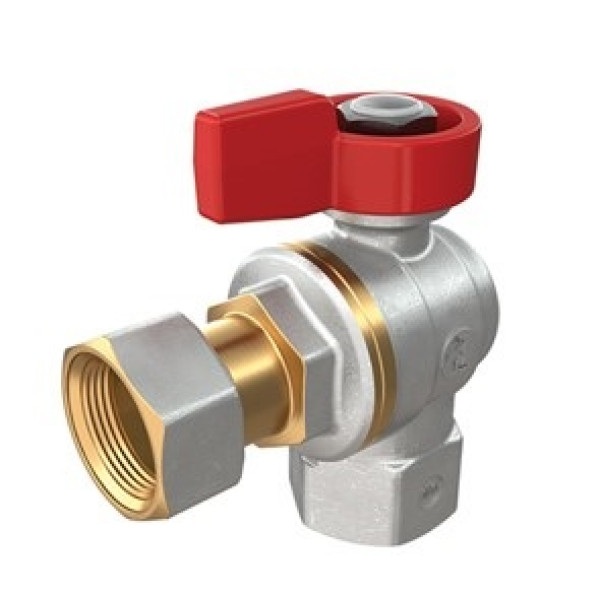 Корпус крана виготовлений із латуні з нікельовим покриттям кутової форми. Кульовий затвор забезпечує повне відкриття або закриття одним поворотом на 90°. Ущільнення штока — чотири прокладки: два фторкаучукових кільця та дві тефлонові плоскі прокладки. Подвійне ущільнення гарантує герметичність класу А протягом усього терміну служби без підтягування або ремонту. Гайка кріплення ручки зафіксована пломбою, на корпусі — голографічна наклейка. Накидна гайка забезпечує розбірне з'єднання без зливання системи.