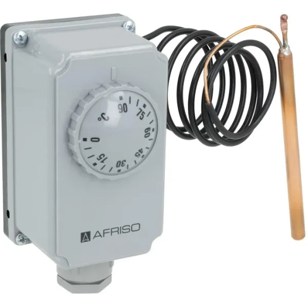 Afriso TC2 6742100 — механічний занурний термостат із виносним датчиком для контролю температури теплоносія в системах опалення. Діапазон 0–90°C, два незалежних контакти (НЗ та НВ), різьба гільзи M20×1,5 — керування насосом або іншим обладнанням без електронних блоків управління.
