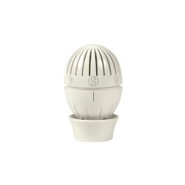 Корпус головки білого кольору з регулювальним колесом. Вбудований рідинний датчик реагує на температуру навколишнього повітря — рідина розширюється або стискається, переміщуючи шток і керуючи затвором клапана. Підключення до клапана CLIP-CLAP: головка фіксується клацанням і так само легко знімається без будь-якого інструменту.