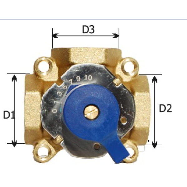 Даний кран має три вхідні/вихідні отвори і виконаний у стандартному форм-факторі для монтажу у трубопровід з різьбою 1". Він зазвичай використовується для перенаправлення потоку рідини в системах опалення, водопостачання або охолодження. Модель підходить для роботи за різних температурних і тискових умов, забезпечуючи надійне та герметичне з'єднання.