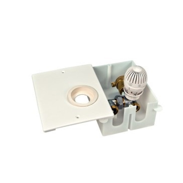 До складу комплекту входять чотири елементи: короб із кришкою (R508M) для прихованого розміщення на стіні, термостатичний клапан (R414M) із латунним корпусом, автоматичний повітровідвідник (R88IY002) та термостатична головка (R470X001) з діапазоном регулювання 8–32°C. Вбудований у клапан відсічний елемент забезпечує гідравлічне балансування контуру. Всі елементи зібрані у єдиний компактний вузол, готовий до підключення.