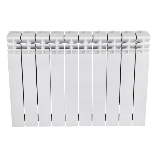 Радіатор виготовлений за технологією біметалу, що поєднує міцність сталі з високою теплопровідністю алюмінію. Внутрішній контур складається з посилених сталевих колекторів товщиною 2,5 мм, які забезпечують герметичність при високому тиску та захищають від корозії при контакті з агресивним теплоносієм. Зовнішня оболонка з алюмінієвого сплаву швидко передає тепло в приміщення. Двоколекторна система містить два вертикальні канали збільшеного січення в кожній секції, що покращує циркуляцію теплоносія. Поверхня покрита дворівневим лакофарбовим покриттям методом порошкового напилення, що створює рівне глянсове покриття білого кольору зі стійкістю до механічних пошкоджень.