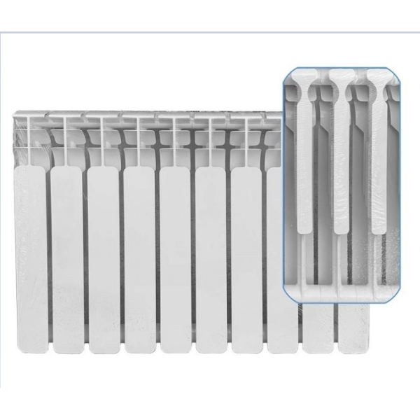 Радіатор виготовлений за унікальним методом лиття двох металів. Серцевина радіатора має безшовну конструкцію зі сталі, яка забезпечує стійкість до гідроударів та продовжує термін служби приладу. Зовнішня частина виконана з алюмінієвого сплаву, який забезпечує максимальну теплопровідність та дозволяє економити на теплових витратах без шкоди для комфорту. Збільшена глибина секцій 96 мм створює посилену площу теплознімання для ефективного прогріву повітря в приміщенні. Така комбінація матеріалів забезпечує оптимальний баланс між надійністю конструкції та високою теплопродуктивністю. Поверхня покрита білим порошковим покриттям з антикорозійними властивостями, що гарантує довговічність та естетичний вигляд.