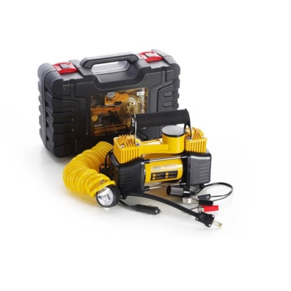 Компресор побудований на базі двопоршневого двигуна, що забезпечує високу продуктивність при компактних габаритах. Живлення здійснюється від акумулятора автомобіля через дві стандартні клеми. Кручений повітряний шланг довжиною 5 метрів оснащений аналоговим манометром для зручного контролю тиску. Пристрій має вбудований захист від перевантажень. Поставляється у пластиковому кейсі для зручного зберігання та транспортування.
