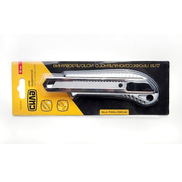 Ніж висувний СИЛА 18 мм з автозамком — будівельний ніж з металевим корпусом та гумовою вставкою для надійного хвату. Лезо з інструментальної сталі шириною 18 мм, механізм автоматичного блокування леза. Чорно-сріблястий корпус.