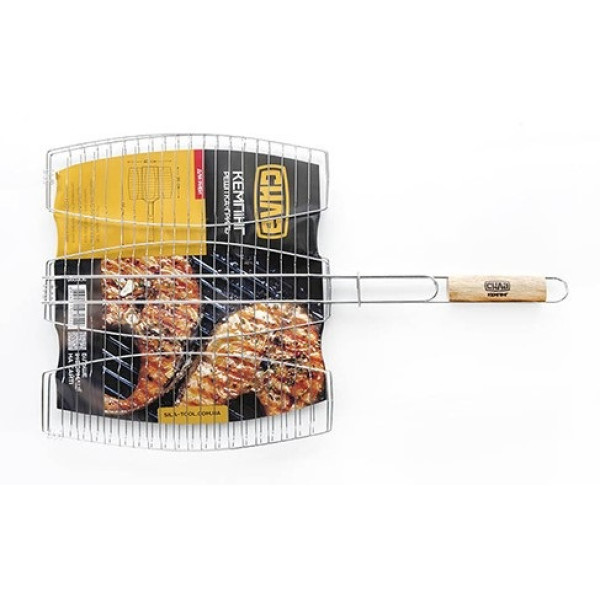 Решітка виготовлена з нержавіючої сталі, яка витримує високі температури і не піддається корозії. Потрійна конструкція складається з трьох окремих секцій для фіксації риби. Кожна секція затискає рибу між двома сітками, що дозволяє легко перевертати без ризику розвалювання продукту.