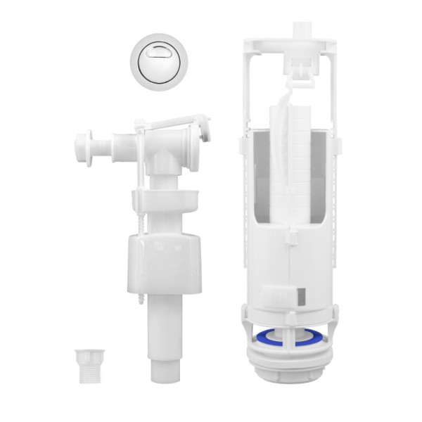 Арматура виготовлена з міцного пластику, стійкого до вологи та хімічних засобів. Конструкція включає поплавковий механізм для контролю рівня води та двокнопковий вузол для регулювання зливу. Боковий клапан забезпечує швидке та зручне підключення до водопостачання.