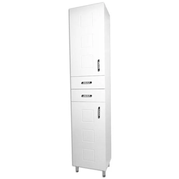 Пенал виготовлений з вологостійких матеріалів, що забезпечують тривалий термін служби у вологих умовах ванної кімнати. Конструкція складається з корпусу з міцних панелей, оснащених дверцятами з відповідними петлями, корзиною для нижнього відсіку та шухлядами з направляючими для плавного й зручного відкривання. Поверхня покрита захисним шаром, що запобігає пошкодженням від вологи.