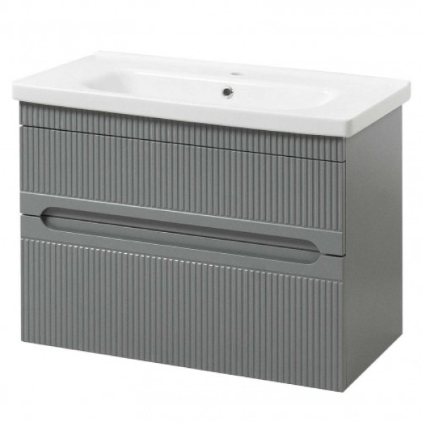 Каркас тумби виготовлений із вологостійкого МДФ із міцним матовим покриттям, що імітує бетон. Умивальник виконаний з якісної білої кераміки, що має гладку поверхню і стійкість до подряпин та хімічних речовин. Фурнітура надійна та забезпечує плавне відкривання дверцят або висувних ящиків.