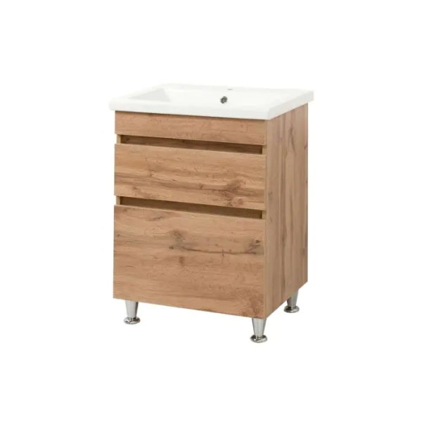Тумба виготовлена із вологостійких плит із ламінованим покриттям, що забезпечує довгий строк служби в умовах підвищеної вологості. Конструкція включає міцний корпус з гладкими фасадами, які легко очищаються від забруднень. Елементи виготовлені з екологічно безпечних матеріалів з акцентом на практичність і надійність.