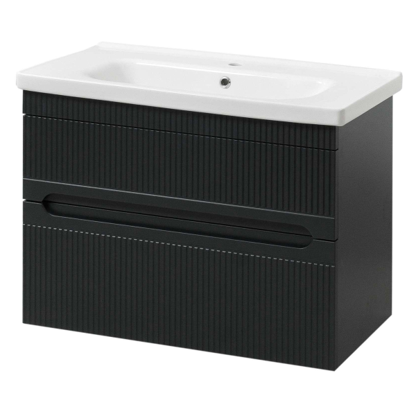Корпус тумби виготовлений з ламінованого ДСП високої якості, що забезпечує стійкість до вологи та механічних пошкоджень. Фасад має матове антрацитове покриття, яке не лише додає сучасності дизайну, а й просте в очищенні. Умивальник виконаний із міцного керамічного матеріалу, що забезпечує довгий термін служби і комфорт під час використання.