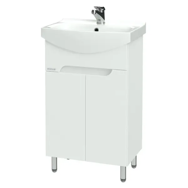 Тумба має прямокутну форму з оптимальними габаритами, що дозволяє розмістити її навіть у невеликих ванних кімнатах. Вона підходить для установки з умивальниками стандартного типу шириною 50 см та володіє практичними шухлядами і відсіками для зберігання необхідних речей. Матеріали та виконання відповідають сучасним вимогам до вологостійкості та довговічності.