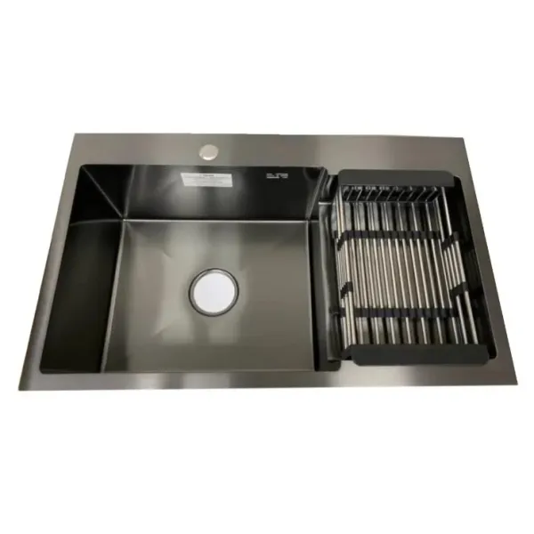 Мийка KRAFT Handmade ЧОРНА 780*480*230 + корзина (змішувач над раковиною) — надійна кухонна мийка преміальної серії Handmade з хромонікелевої нержавіючої сталі товщиною 3 мм у стильному чорному кольорі. Одна глибока чаша 230 мм із лівим крилом, отвір для змішувача над раковиною, кошик для сушіння та кріплення в комплекті — все готове до встановлення та використання.