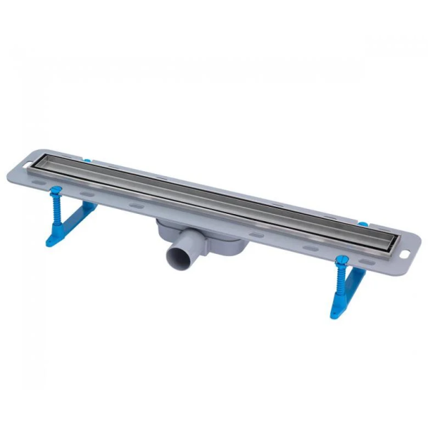 Лінійний душовий трап довжиною 700 мм із корпусом із потовщеної нержавіючої сталі INOX 316. Двостороння решітка 2-в-1 (під плитку / метал), мокрий гідрозатвор, горизонтальний випуск 90° Ø50 мм. Пропускна здатність — 36 л/хв. Фланець є. Регульовані опори в комплекті. Гарантія 24 місяці.