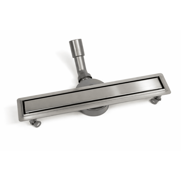 PL 5304 — лінійний душовий канал 70 см із майданчиком під керамічну плитку. Плиткова вставка дозволяє облицювати решітку в тон підлоги — канал стає практично невидимим. Поворотний сифон обертається на 360°, що дозволяє підключитися до каналізації з будь-якого боку. Сухий затвор блокує запахи незалежно від частоти використання душу. Ніжки регулюються у діапазоні 70–100 мм.