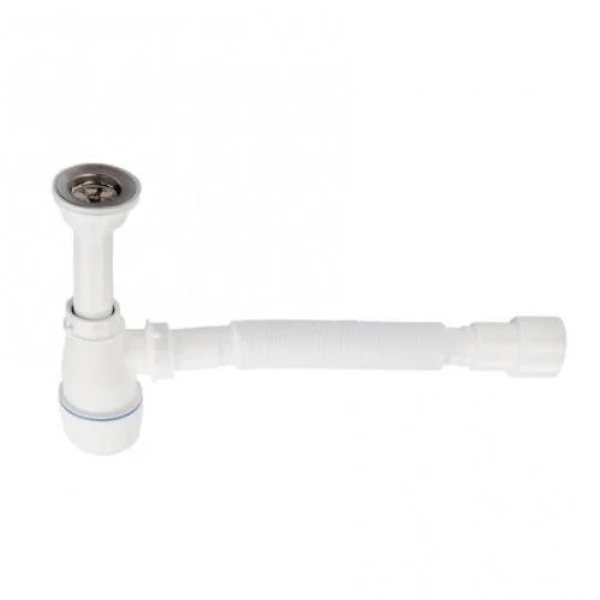 Пляшковий сифон для біде з гнучким гофрованим виходом у каналізацію Ø40/50 мм. Підключення 1 1/2", діаметр металевої накладки 65 мм. Довжина гофри регулюється від 350 до 800 мм, висота корпусу — від 155 до 210 мм. Колір білий, матеріал — пластик із нержавіючою сталлю.