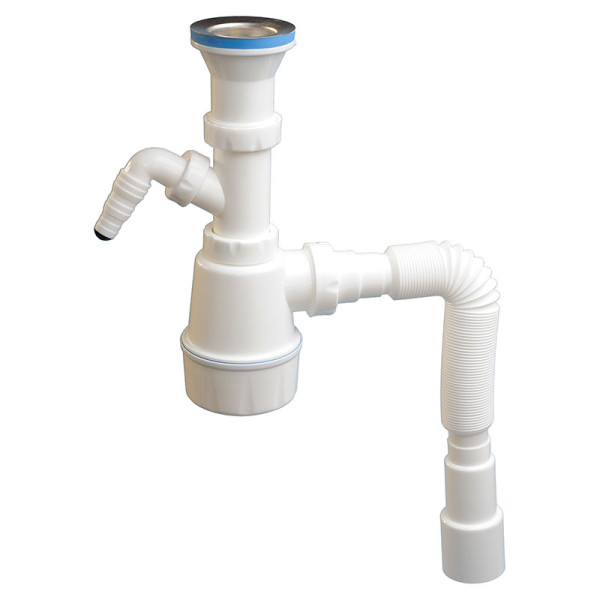 Прямоточний сифон U-подібної конструкції для кухонних мийок з підключенням 2 1/2". Діаметр горловини — 70 мм, решітка з нержавіючої сталі 304, вихід у каналізацію Ø40/50 мм через гофровипуск довжиною 70 см. Гвинт кріплення — 50 мм. Розбірна конструкція випуску. Без переливу. Матеріал корпусу — пластик, колір білий.