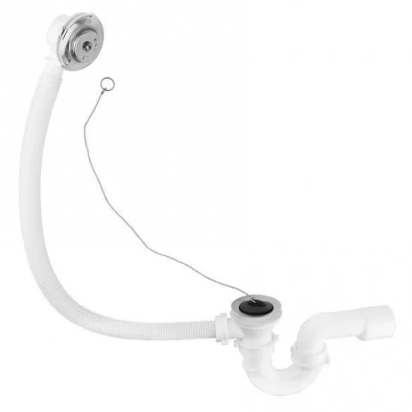 Трубний сифон для ванни з переливом, пробкою та ланцюжком. Діаметр випуску 70 мм, вихід у каналізацію Ø50 мм, довжина жорсткого відводу 20 см. Швидкість зливу 50 л/хв. Матеріал — нержавіюча сталь/пластик, колір білий.