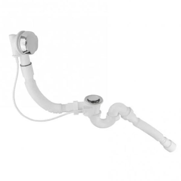 Трубчастий сифон для ванни з переливом і автоматичним механізмом керування зливом. Корпус — латунь. Діаметр горловини 70 мм, підключення 1 1/2", вихід у каналізацію Ø40/50 мм. Довжина гофротруби регулюється від 33 до 78 см.